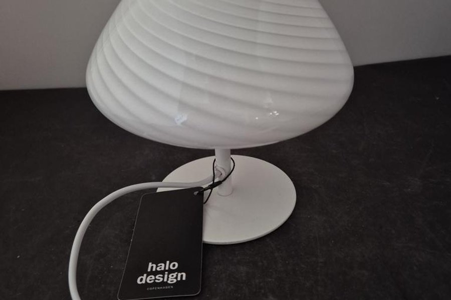 Bordslampa från Halo Design Copenhagen. Lampan har en vit bas och en vit skärm med spiralmönster.