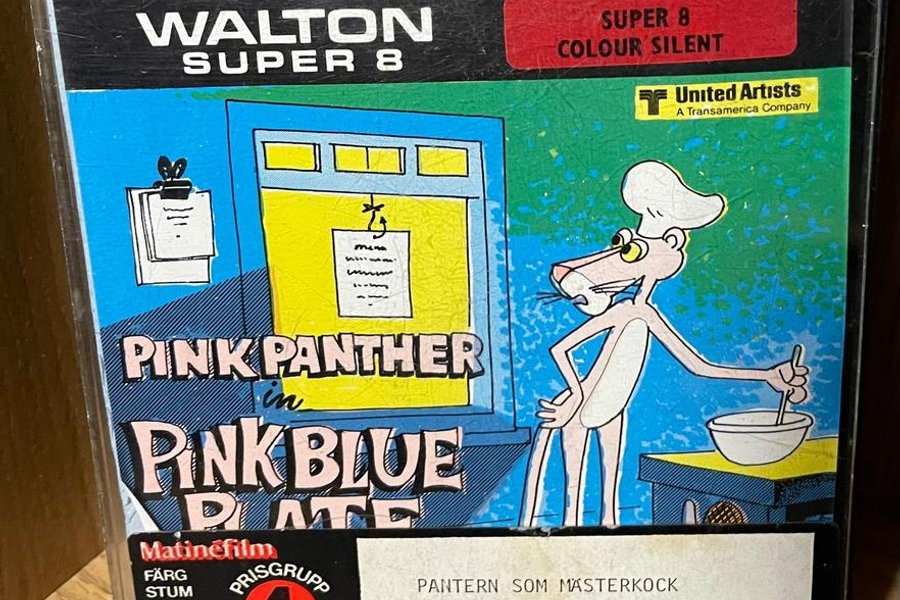 Super 8 film med Rosa Pantern i 'Pantern som mästerkock'. Färg, stum. Längd ca 45 m.
