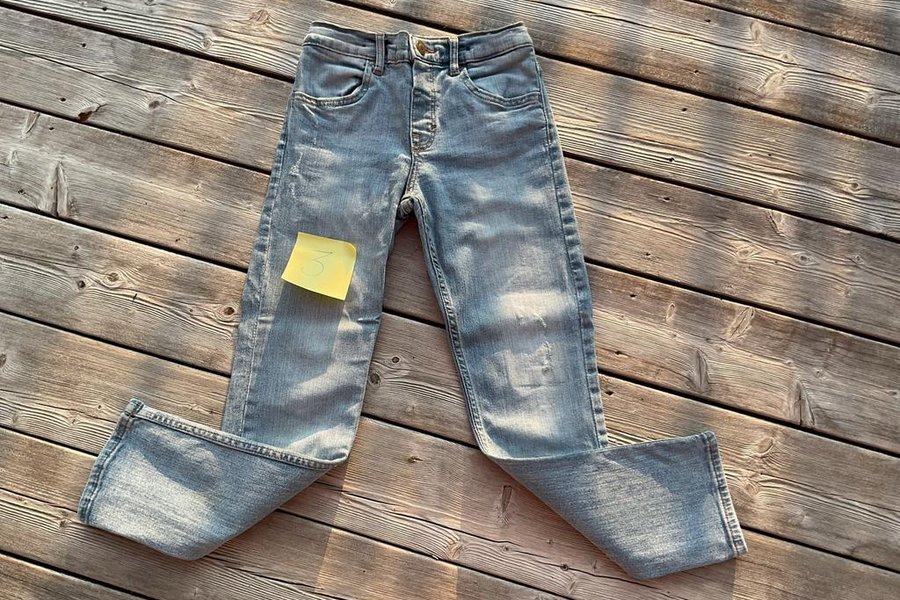Ett par ljusblå jeans slim fit, stretch, reglerbar i midjan, utseende= ska se ut som ”lagningar” på några ställen. Stl.134. Nyskick.