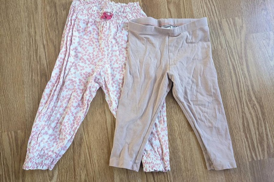 Ett set med två par byxor. Ett par är vita med ett rosa blommönster och resår i midjan och bensluten (från åhlens). Det andra paret är enfärgat rosa och har en resår i midjan (från H&M).