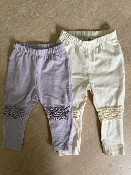 Två par leggings i olika färger. Båda har resår i midjan och volangdetaljer vid knäna.