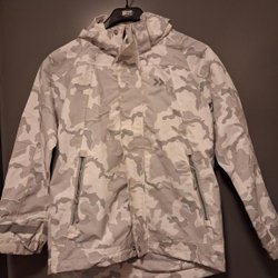 Vit jacka till våren med ett grått kamouflagemönster. Skyddar mot regn och vind.