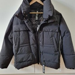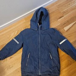 Blå jacka med huva, dragkedja och fickor framtill. Jackan har reflexer på ärmarna och logotyp på baksidan.