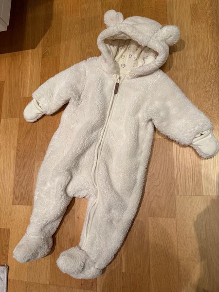Vit teddyoverall med luva med små öron. Overallen har dragkedja framtill och övervikbara muddar vid ärmslut men stängda fötter. En liten kaninstumpsvans på rumpan.