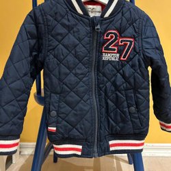 Ett blått regnställ från Everest i storlek 122/128. Regnjackan har en vit dragkedja framtill och två fickor med tryckknappar. Både jackan och byxorna har reflexdetaljer. Litet hål under knäet på högra benet. Resårerna under benen borta, Namnad.