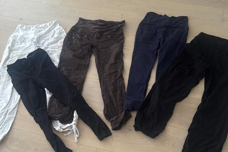 Här är ett set med byxor i olika färger och stilar. Setet innehåller byxor i vitt, brunt, marinblått ( 42) och svarta mjukisbyxor samt svarta leggings ((m) . Perfekt för att variera din garderob.