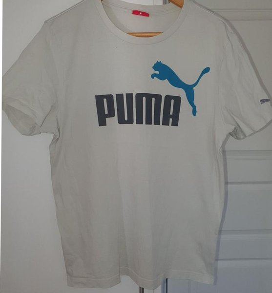 T-shirt, vit med ett stort svart tryck av Pumas logotyp på framsidan. T-shirten har korta ärmar och en rund halsringning. Storlek Bredd 45 cm Längd 69 cm.