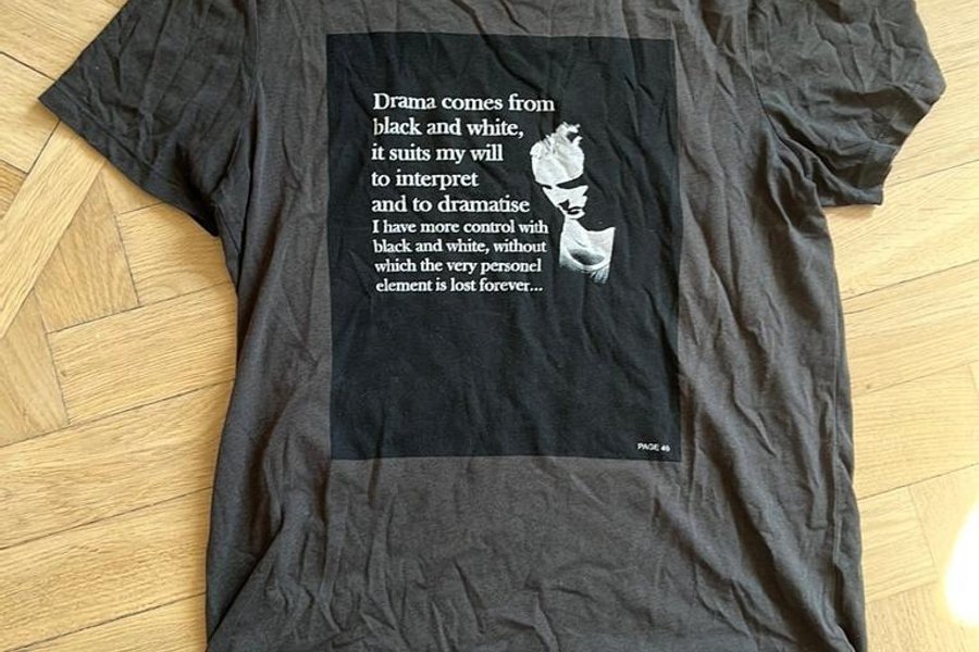 Grå t-shirt med ett svart tryck som innehåller en bild och texten ”Drama comes from black and white, it suits my will to interpret and to dramatise I have more control with black and white, without which the very personel element is lost forever... PAGE 46”.