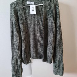 Färgglad stickad tröja med långa ärmar och en krage med knappar. Tröjan har ett randigt mönster i blått, grönt, vitt och rött.