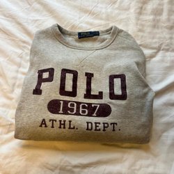 En grå sweatshirt från Polo Ralph Lauren. Tröjan har ett tryck på framsidan med texten "POLO 1967 ATHL. DEPT." i mörkare rött.