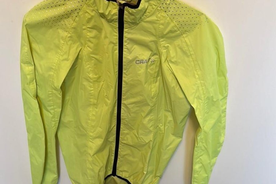 En gul jacka med svarta detaljer. Jackan har en dragkedja framtill och en huva. Den har även reflexdetaljer på axlarna.