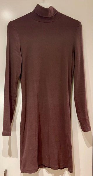 Brun, ribbstickad klänning med lång ärm och polokrage.