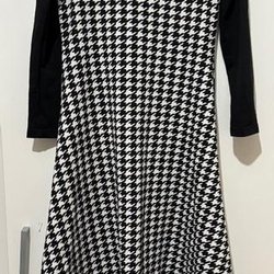 En svart klänning med en strukturerad yta. Klänningen har en v-ringning och en lös passform med insydda veck under bysten som skapar volym. Ärmarna är trekvartslånga och den har fickor i sidorna.