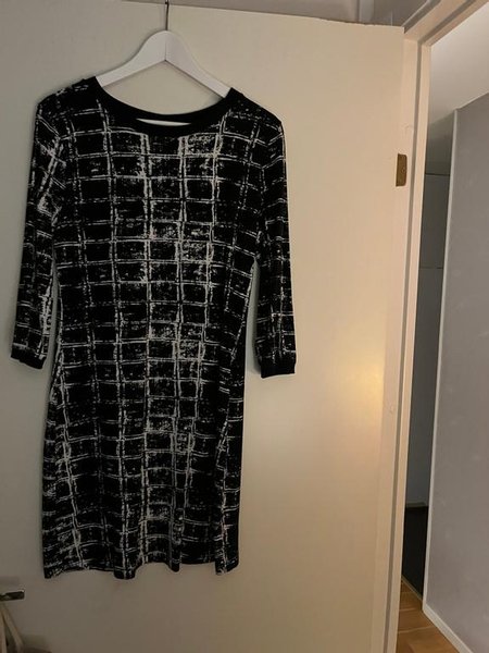 Svart klänning med ett grafiskt, rutigt mönster i vitt. Klänningen har en rund halsringning och 3/4-långa ärmar. Passar både till vardags och fest.