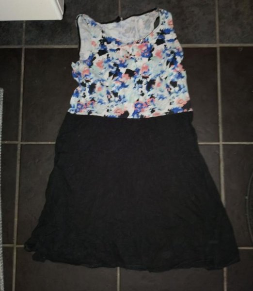 Klänning med blommigt tryck upptill och svart kjol nedtill. Klänningen har en avslappnad passform. Bystmått ca 41cm och längd ca 84cm