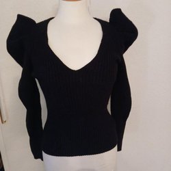 Svart blus med volanger runt halsen och korta ärmar. Klänningen har en lös passform.