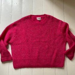 En stickad tröja i en ljus nyans med volangdetaljer längs ärmarna. Tröjan har en rund halsringning och en ribbad struktur. Volangerna ger en lekfull touch till plagget. Lite smått nopprig men inget som syns.
