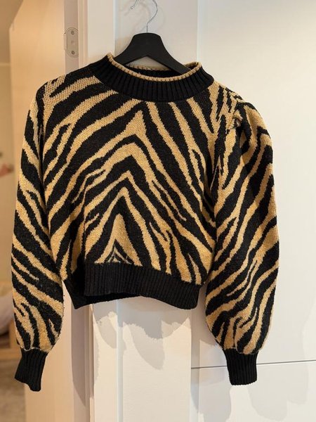 Stickad tröja med zebramönster i svart och beige. Tröjan har en hög hals och puffärmar.