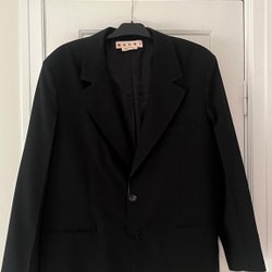 Snygg randig kavaj i grått. Lång rak modell. Kavajen har enkelknäppning fram och tre dekorativa knappar på ärmarna. Fodrad insida. Oanvänd och som ny. Något skrynklig just nu då jag städat garderoben och lagt kläder på varann.