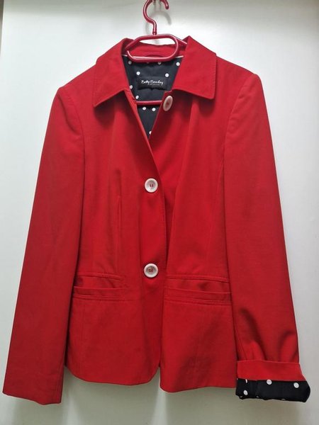 Röd kavaj från Betty Barclay Collection med tre knappar framtill och två fickor. Kavajen har ett svart foder med vita prickar.