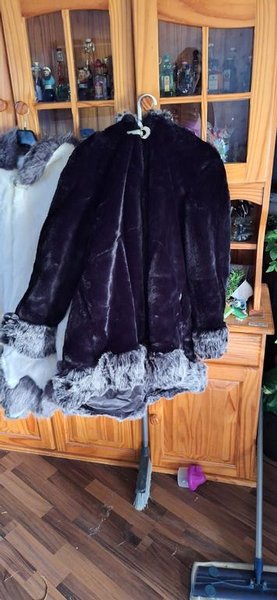 Elegant svart fuskpälscape med grå detaljer vid ärmslut och nederkant. Jackan har en vacker spänne vid halsen som ger en extra touch av glamour. Perfekt för att hålla värmen med stil under kyliga dagar.