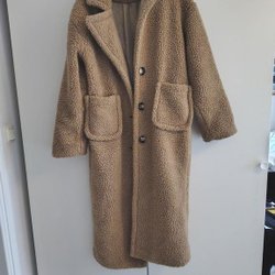 Lång beige fuskpälskappa med krage och knappar framtill. Två fickor fram. Strlk 38.
