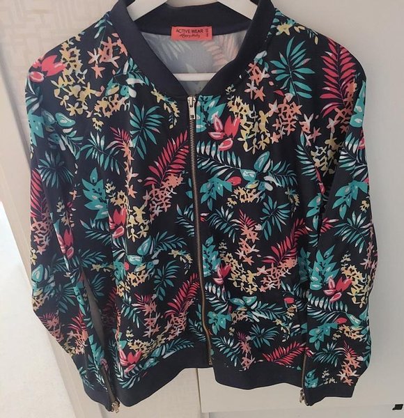 Färgglad bomberjacka med ett blommigt mönster i olika färger som rött, gult, grönt och rosa. Jackan har en dragkedja framtill och muddar vid halsringningen, ärmsluten och nederkanten.