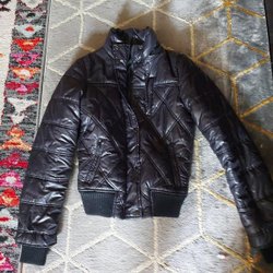 Svart jacka med quiltat mönster och ribbstickade muddar. Jackan har en hög krage och stängs med dragkedja. 2sidofickor med dragkjedja