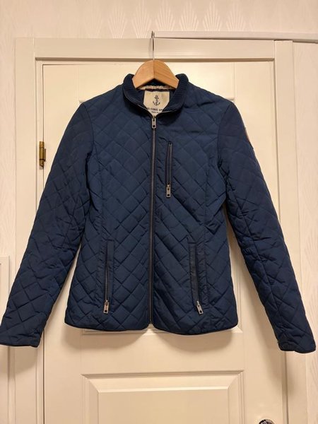 Mörkblå quiltad jacka med dragkedja framtill. Jackan har en ribbad krage och tre fickor med dragkedja, varav två är placerade nedtill och en mindre på bröstet. Den quiltade designen ger jackan en klassisk look.