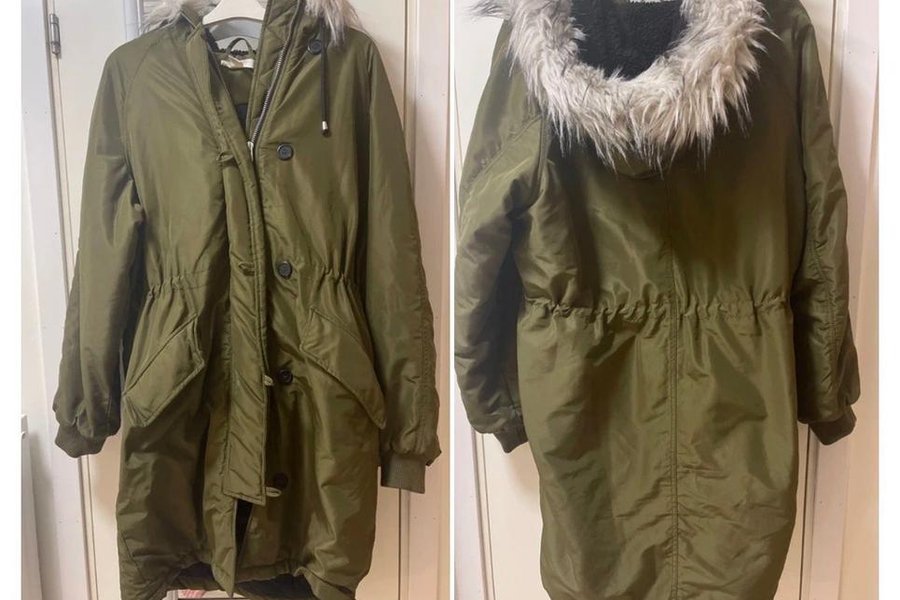 Khakifärgad parkas med dragsko i midjan och huva med fuskpäls. Jackan har fickor fram och stängs med både dragkedja och knappar.