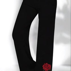 Eleganta svarta byxor med en röd ros detalj på benet. Byxorna har en bekväm passform och en stilren design.
