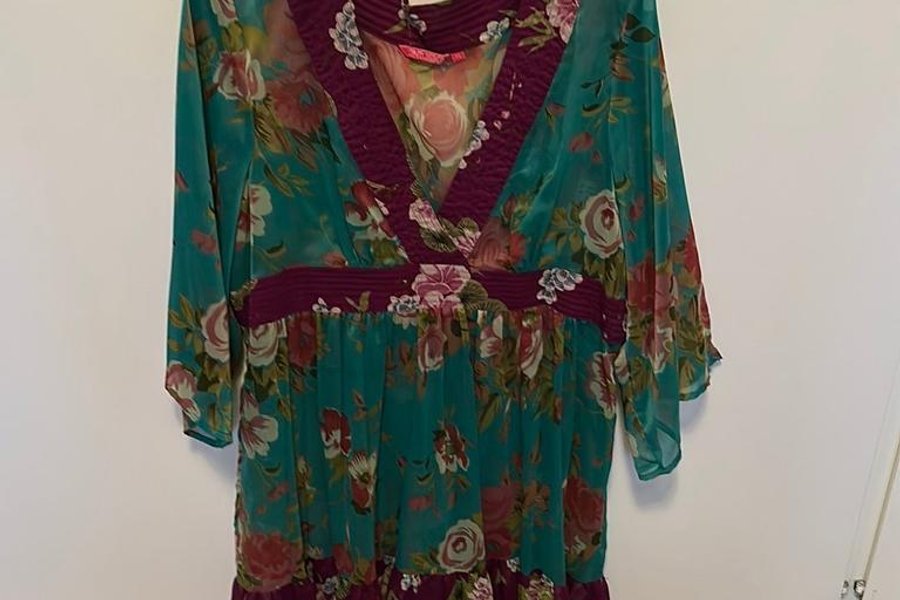 Färgglad tunika med blommigt mönster i gröna och rosa toner. Tunikan har en v-ringning med lila detaljer och en lila kant nedtill.