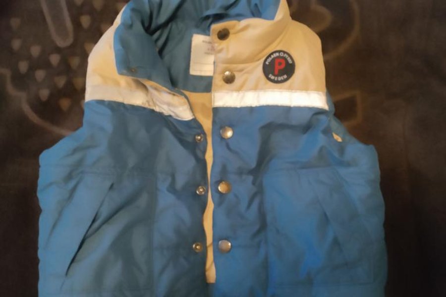 Vadderad väst i blått och beige med tryck på bröstet och knappar framtill. Västen har fickor fram. Kan skickas som rekommenderat brev