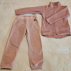 Ett tvådelat set bestående av en långärmad tröja och matchande leggings med borstadinsida. Båda plaggen har ett heltäckande mönster med olika dinosaurier i flera färger. Tröjan har ribbade muddar vid ärmslut och nederkant. Leggingsen har resår i midjan. Fint skick utan fläckar men är tvättpåverkade så som förekomst av ytludd. Ej uttöjda men lätt tunnare över knäparti. Finns ett hål på insidan i nacken, ej genomgående.