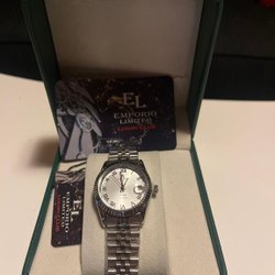 Emporio Limited Capri Collection Quartz damklocka. Klockan har ett silverfärgat boett och länk i rostfritt stål. Urtavlan är vit med romerska siffror och datumvisning. Klockan är vattentålig.
