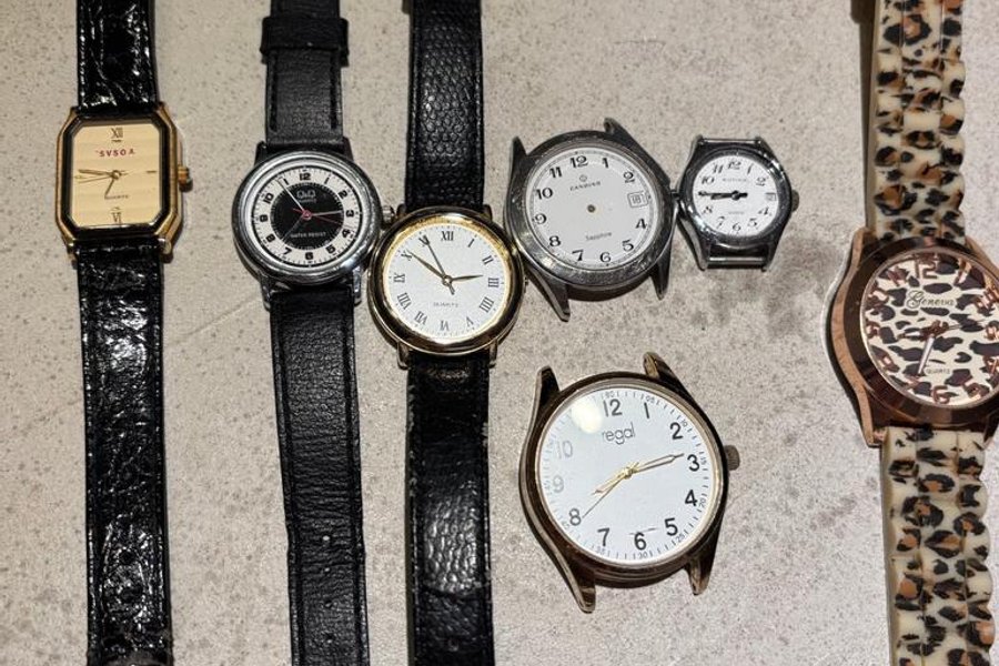 Parti med armbandsur. Inkluderar märken som YOSAS, Q&Q, Dandino, Witina, Regal och Geneva. Candino saknar visare och krona. Rutina saknar glas.