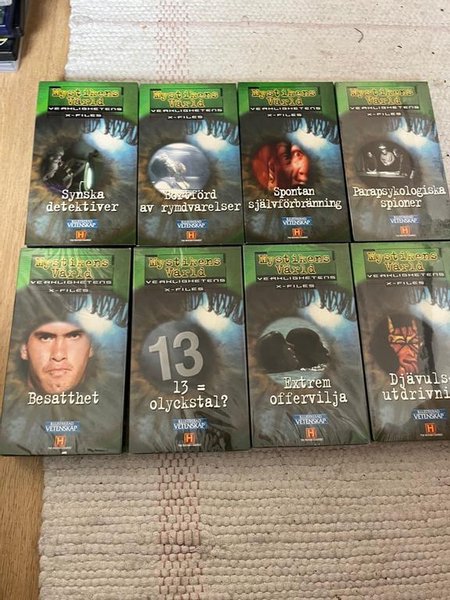 Samling av Mystikens Värld Verklighetens X-Files VHS Innehåller följande nummer: Synska detektiver, Bortförd av rymdvarelser, Spontan självförbränning, Parapsykologiska spioner, Besatthet, 13 = olyckstal?, Extrem offervilja, Djävulsutdrivning.5 st oöppnade