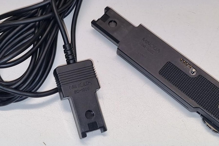 Säljer en Minolta BR-1000 blixtskena och en Minolta EC-1000 förlägningskabel.