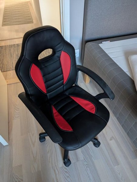 Liten "gamingstol" XP Junior från MIO med svart och röd klädsel i konstläder. Stolen har armstöd och hjul. Höj- och sänkbar.