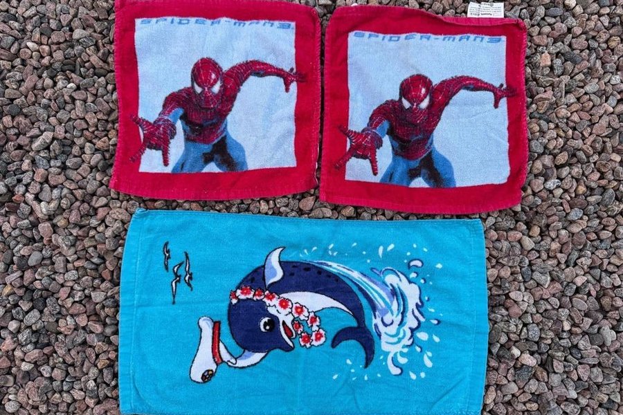 Detta är ett set med tre handdukar. Två av handdukarna har Spindelmannen motiv och den tredje har en delfin med en blomsterkrans.