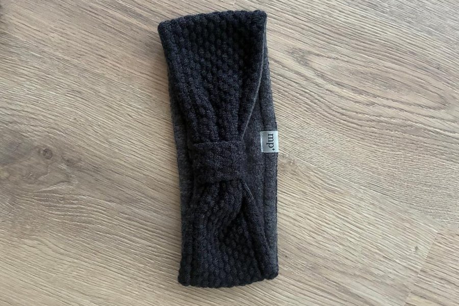 Mørkegråt strikket pandebånd med en dekorativ knude foran. Pandebåndet er designet til at holde håret væk fra ansigtet og give varme på kølige dage.
