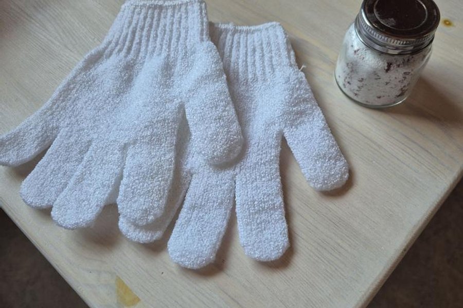 Ett par badhandskar tillsammans med en burk badsalt. Nytt. Betala inom 5 dagar. Skickar med schenker tisdag och fredag.