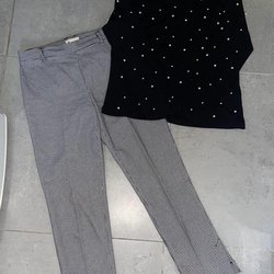 Fint set med en ljusgrå cardigan med en liten hjärtapplikation och ett par vita byxor med hög midja.
