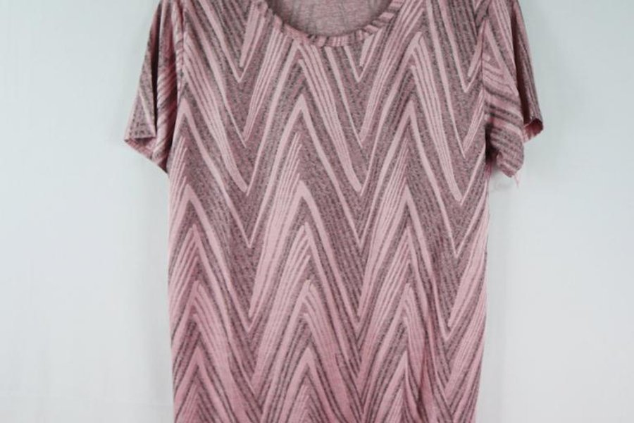 Rosa t-shirt med ett sicksack-mönster i olika nyanser av rosa och grått. Den har en rund halsringning och korta ärmar.