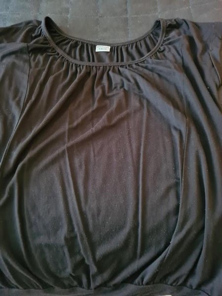Svart topp med en rynkad detalj vid halsen. Toppen har korta ärmar.