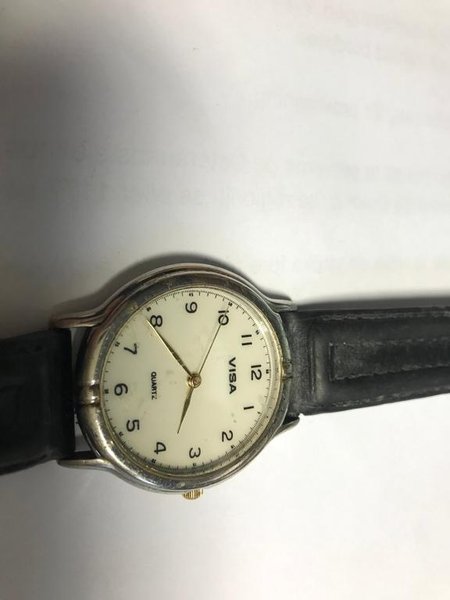 Ett armbandsur från Visa med quartz-urverk. Klockan har en vit urtavla med svarta arabiska siffror och ett svart läderarmband. Boetten är i silverfärgad metall.