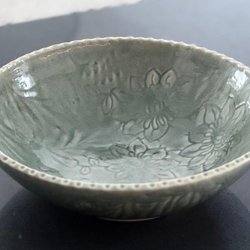 Vit vas med blommigt motiv.