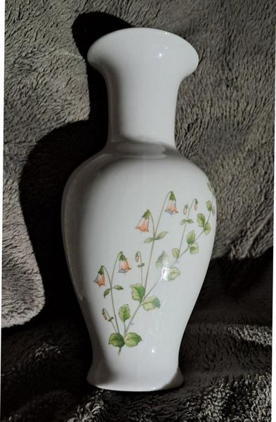 Liten vas från Hackefors Porslin. Dekorerad med mönstret Linnaea Borealis, som består av linnea. Är använd men ännu fin utanpå inuti vasen syns att den är använd