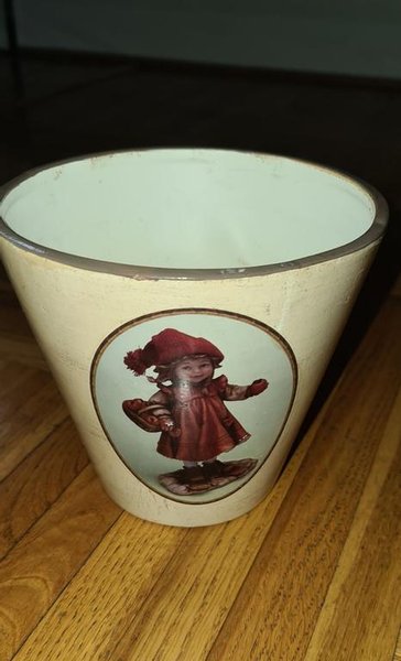 Blomkruka med julmotiv. Höjd 14 cm. Diameter i överkant 15 cm. Krukan är i bra skick.