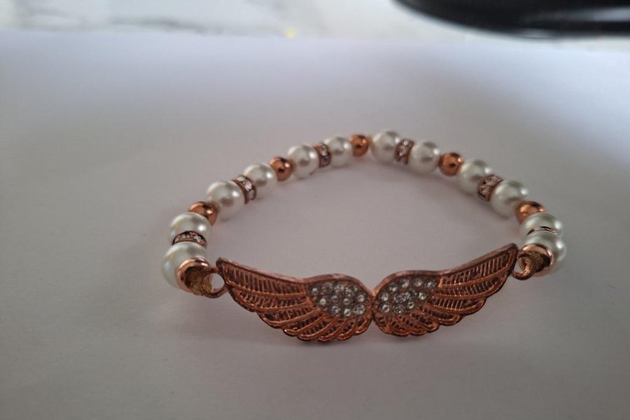 Pärlarmband med strass vinge i Rose färgade. Elastiskt armband med vita pärlor . Nickel säkra delar stl 17 på gummitråd 8 mm tjock och pärlorna på 8 mm stora.